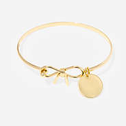 Add a timeless touch of elegance to your jewelry collection with our Personalized Bow Bangle. This delicate bangle features a charming bow detail paired with a sleek, customizable disc that can be engraved with your monogram for a truly personal finish. Crafted for everyday wear, it offers a minimalist yet feminine design available in polished gold or silver tones. Perfect as a meaningful gift or a signature accessory, this personalized bangle effortlessly complements any outfit.