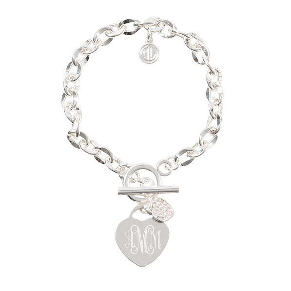 Dress up your look with this beautiful Monogrammed Heart Bracelet! This bracelet measures approximately 7 inches long. Your monogram is engraved on a heart pendant and layered with a smaller pave heart charm. This bracelet would look great paired with our Monogrammed Pave Earrings! Personalize one to add to your jewelry box today!