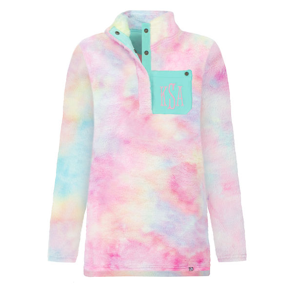 - Monogramed Tie-Dye Sherpa Pullover with stand-up collar featuring snap closure